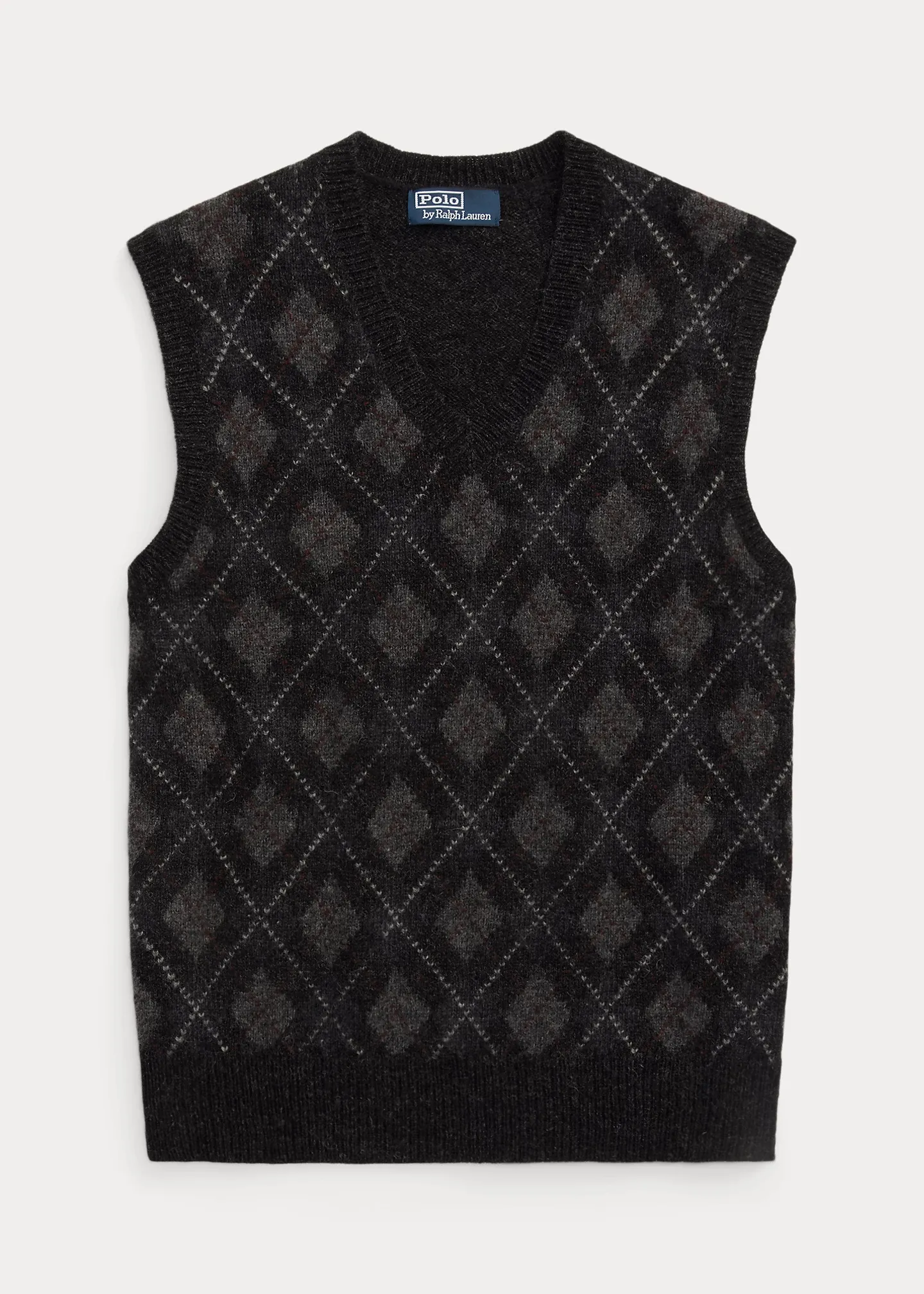 厚手のウールヤーンで作られたこのセーターベストは、クラシックなアルガイルモチーフとチャコールトーンのパレットを組み合わせています。
