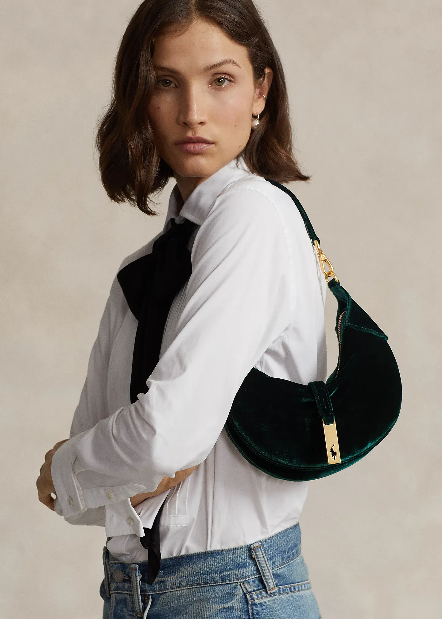 ポロIDコレクションの一部で、冒険、ロマン、楽観主義にインスパイアされたこのベルベットショルダーバッグは、肩掛けバッグからクロワッサン型のリストレットに変形できる二重コンパートメントのサドルシルエットで、活気あるエレガンスと微妙な馬術の感性を呼び起こします。ヴィンテージIDブレスレットを思わせる金色の真鍮ハードウェアにカットアウトされた私たちのシグネチャーポニーのシルエットを展示する真鍮のプレートで仕上げられています。