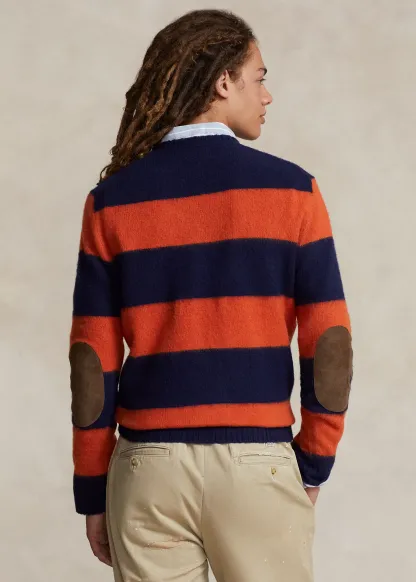 このチャンキー編みのセーターは、ラグビーにインスパイアされたストライプ、スエードの肘パッチ、柔らかいウールとカシミヤの糸を組み合わせています。