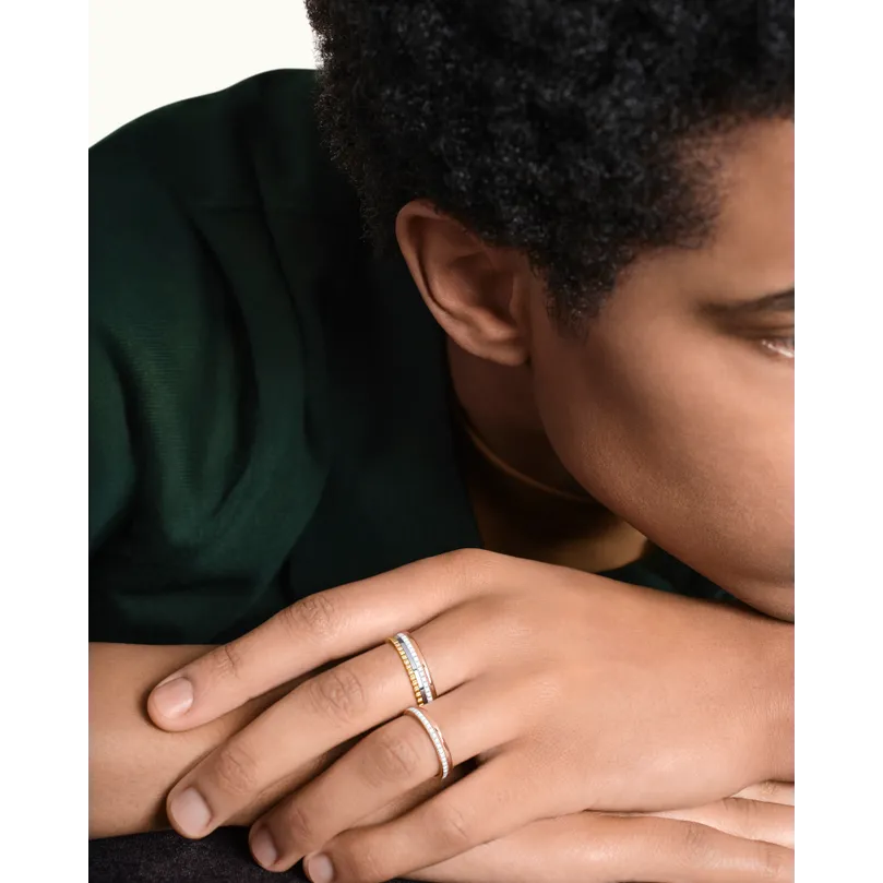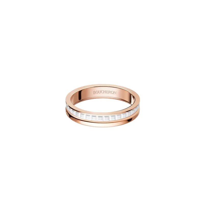 This White Edition wedding band combines two iconic codes from the Quatre collection. The pink gold Godron, symbolizing the love between two people, says "yes" to the Clou de Paris carved in white Hyceram, a nod to the cobblestones of Place Vendôme. Finesse, audacity and contrasting materials: a creation full of character, to be worn alone or in combination with other pieces in the collection.