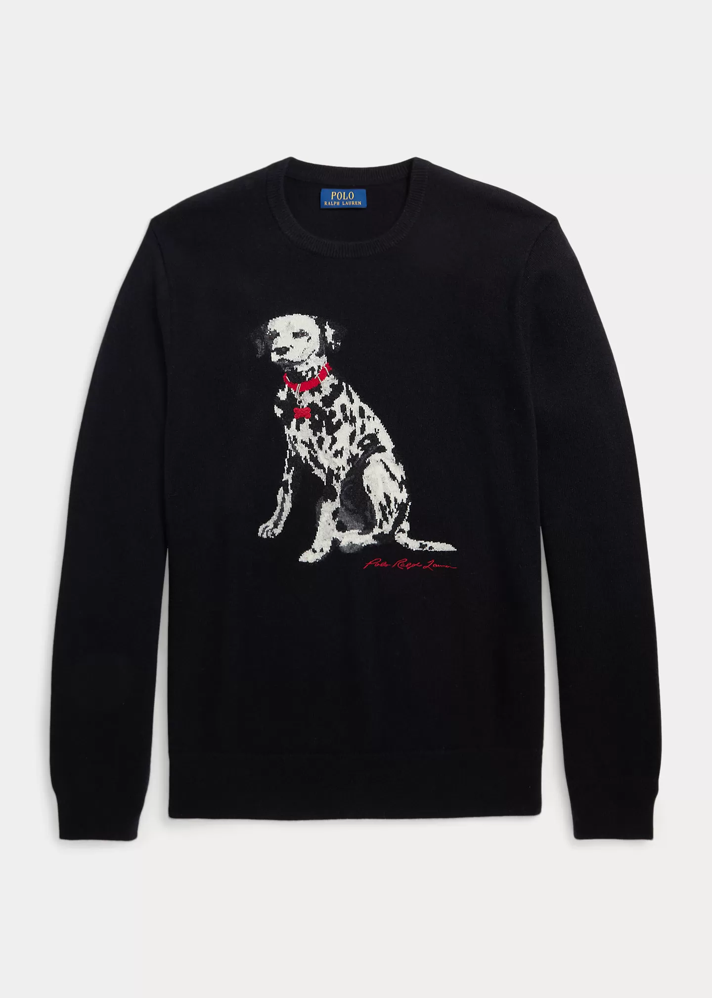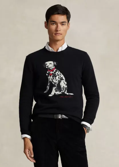 - Dalmatian intarsia-knit at the center front. "Raltktph Lautktren" script embroidered underneath.