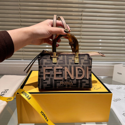 Iconic mini By The Way Boston bag, made of an FF motif jacquard fabric in brown with Fetktndi ROMA lettering in beige leather. Stiff tortoiseshell-effect plexiglass handles. Zip fastening.