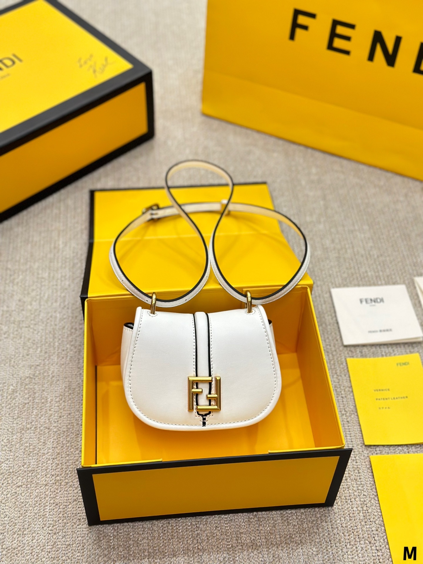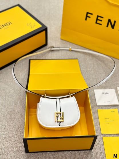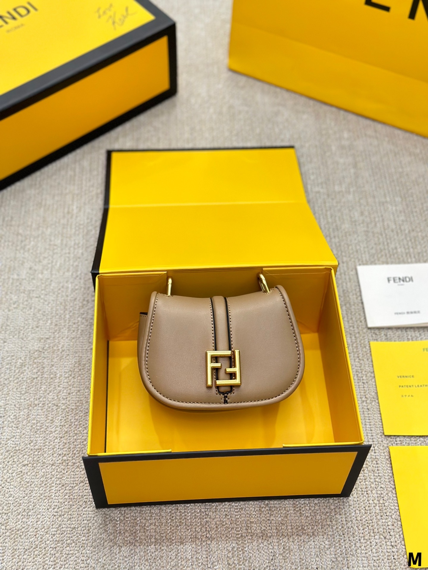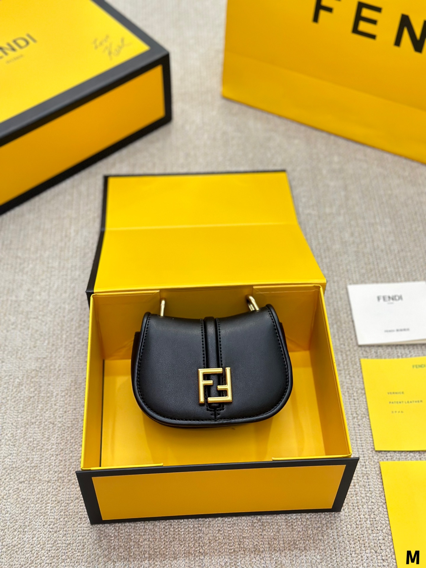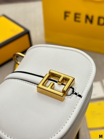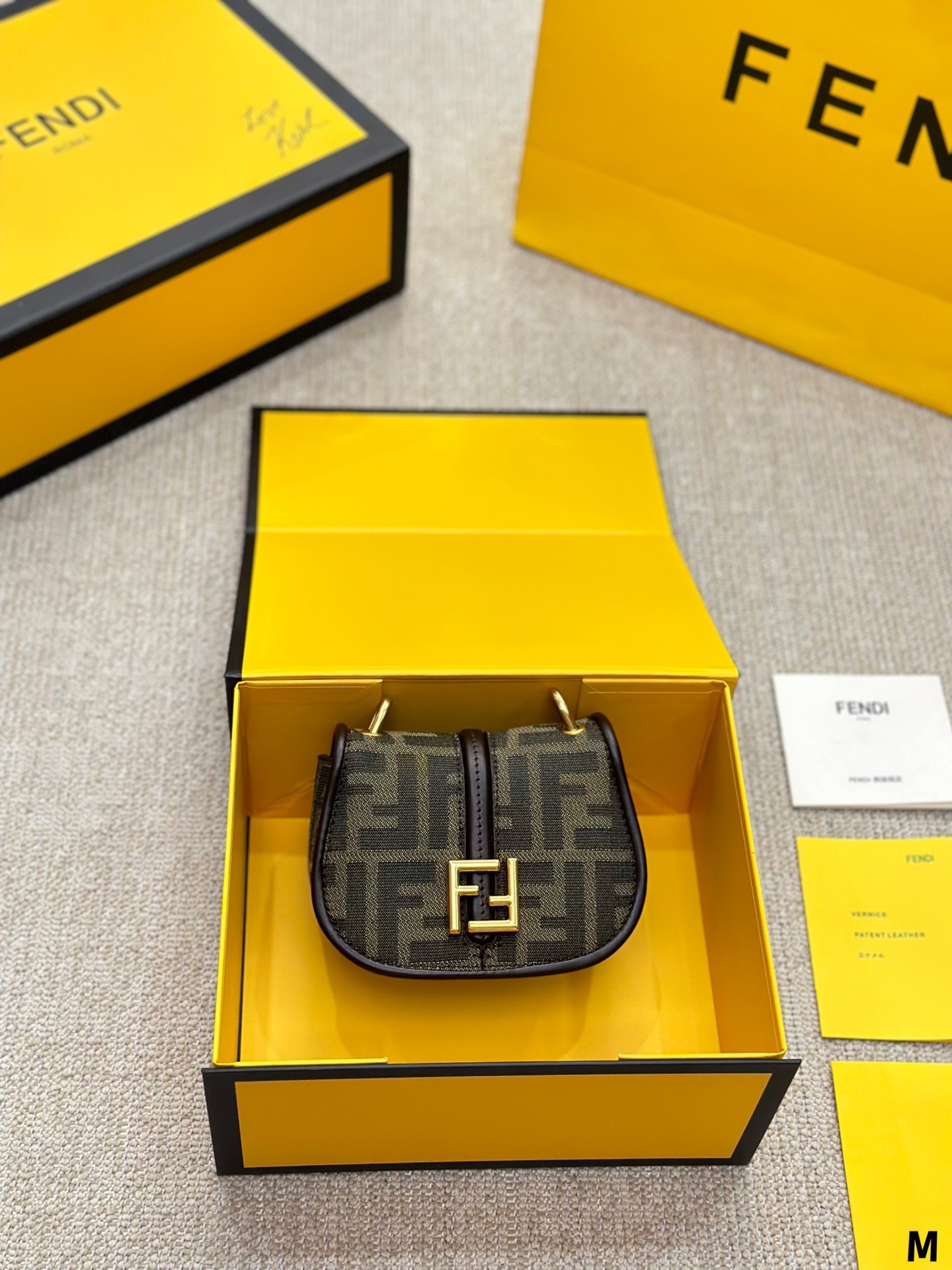 Nano version of the iconic Fetktndi C’mon bag, with flap and FF closure with magnetic clasp. The loop on the back allows it to be worn on a belt as a charm. It can also be worn cross-body thanks to the slender adjustable shoulder strap. Credit card holder flat pocket inside. Made of FF jacquard fabric. Details in dark brown leather. Metal accessories in a vintage-gold finish.