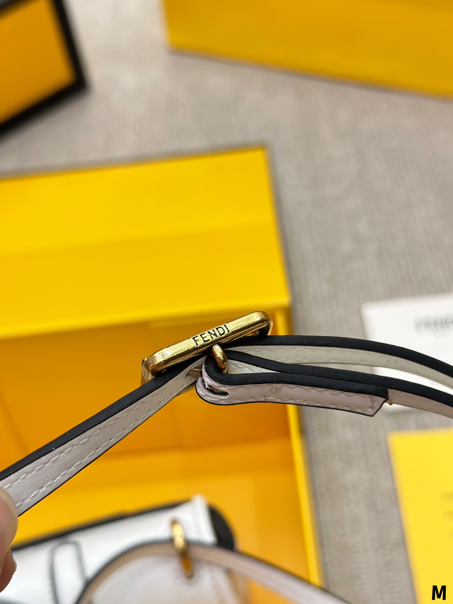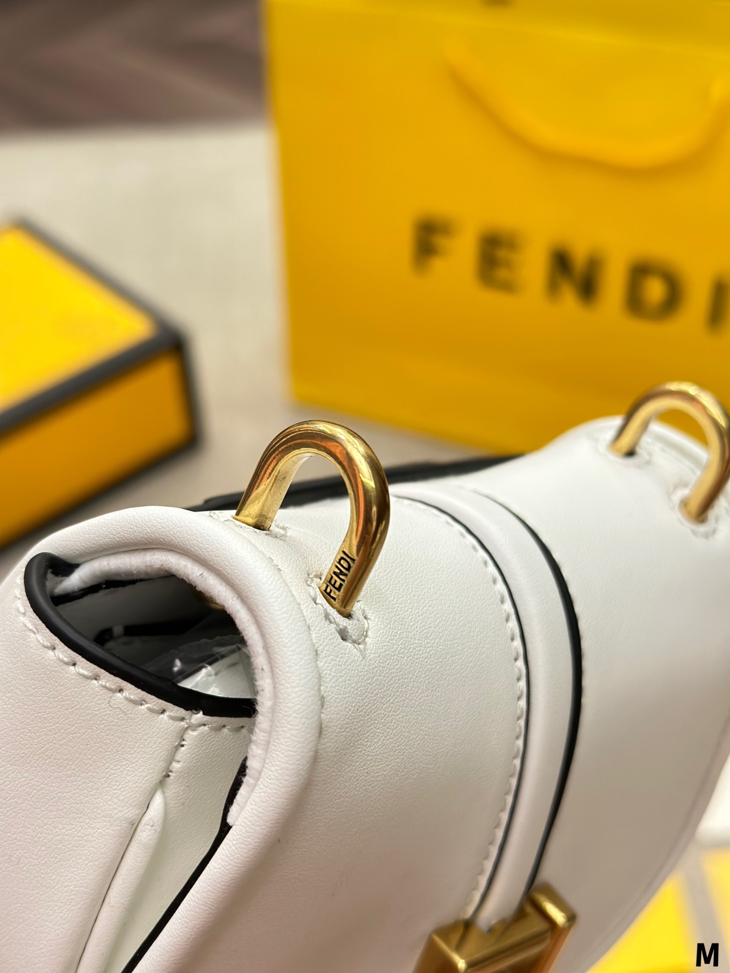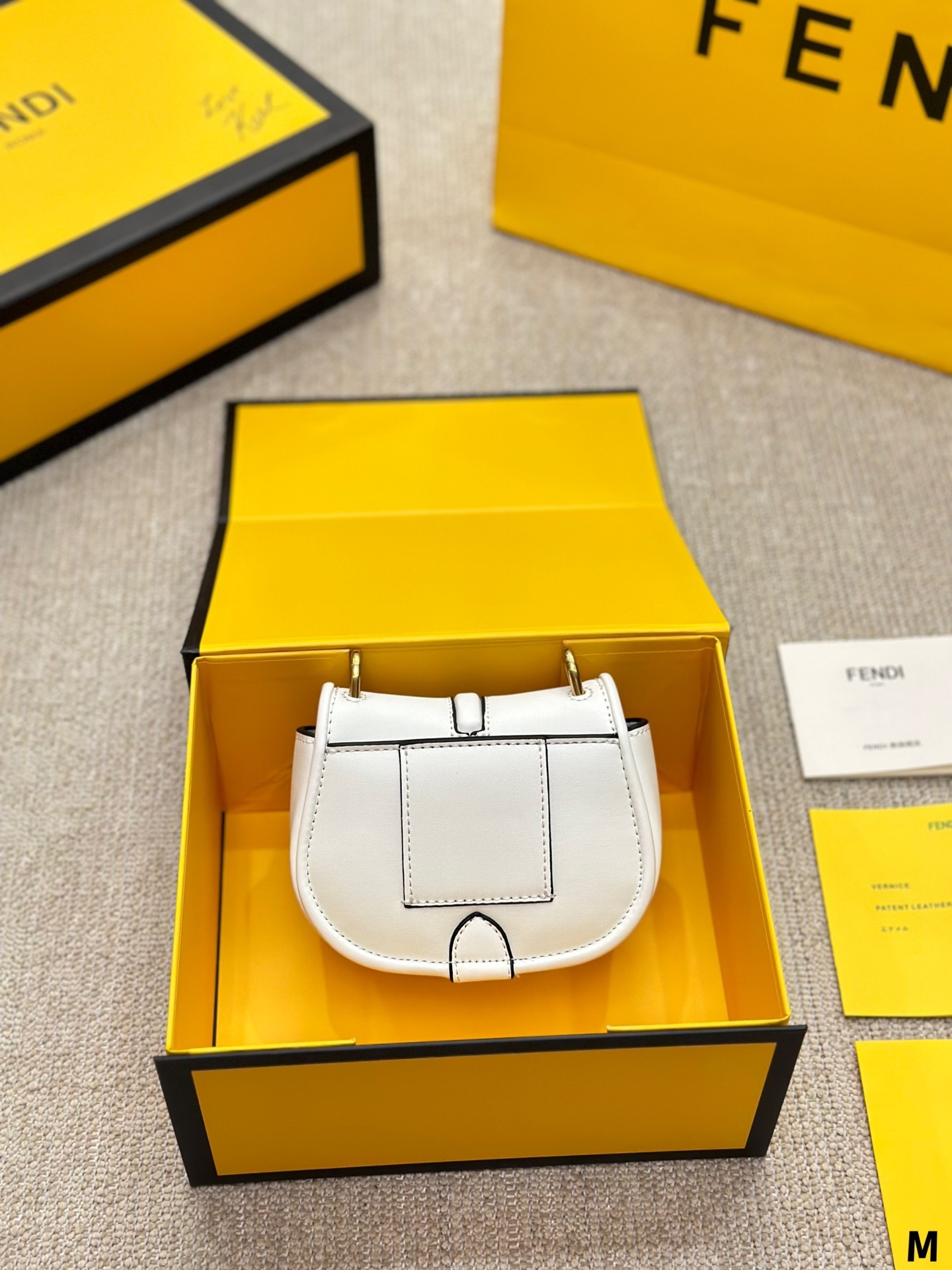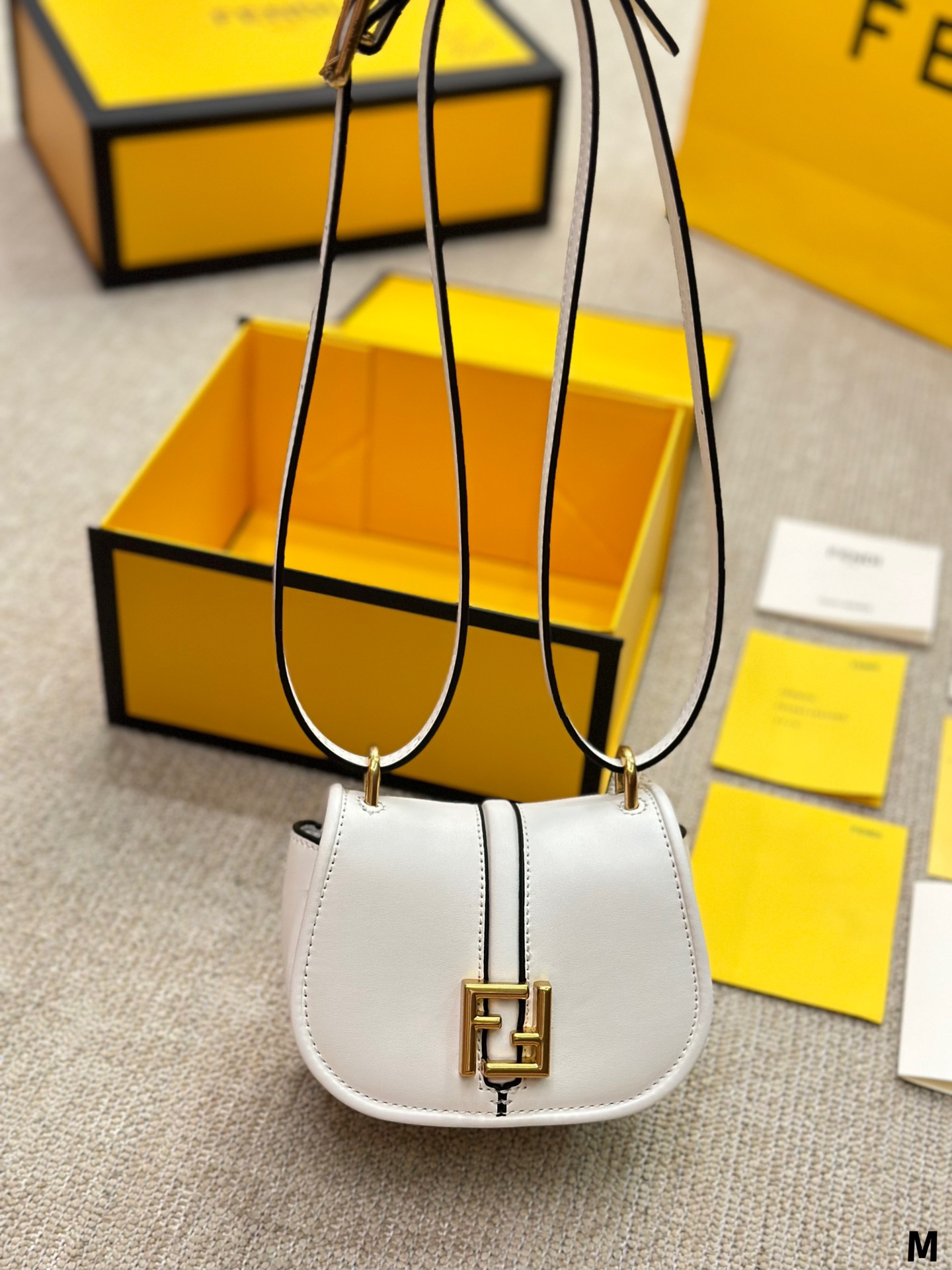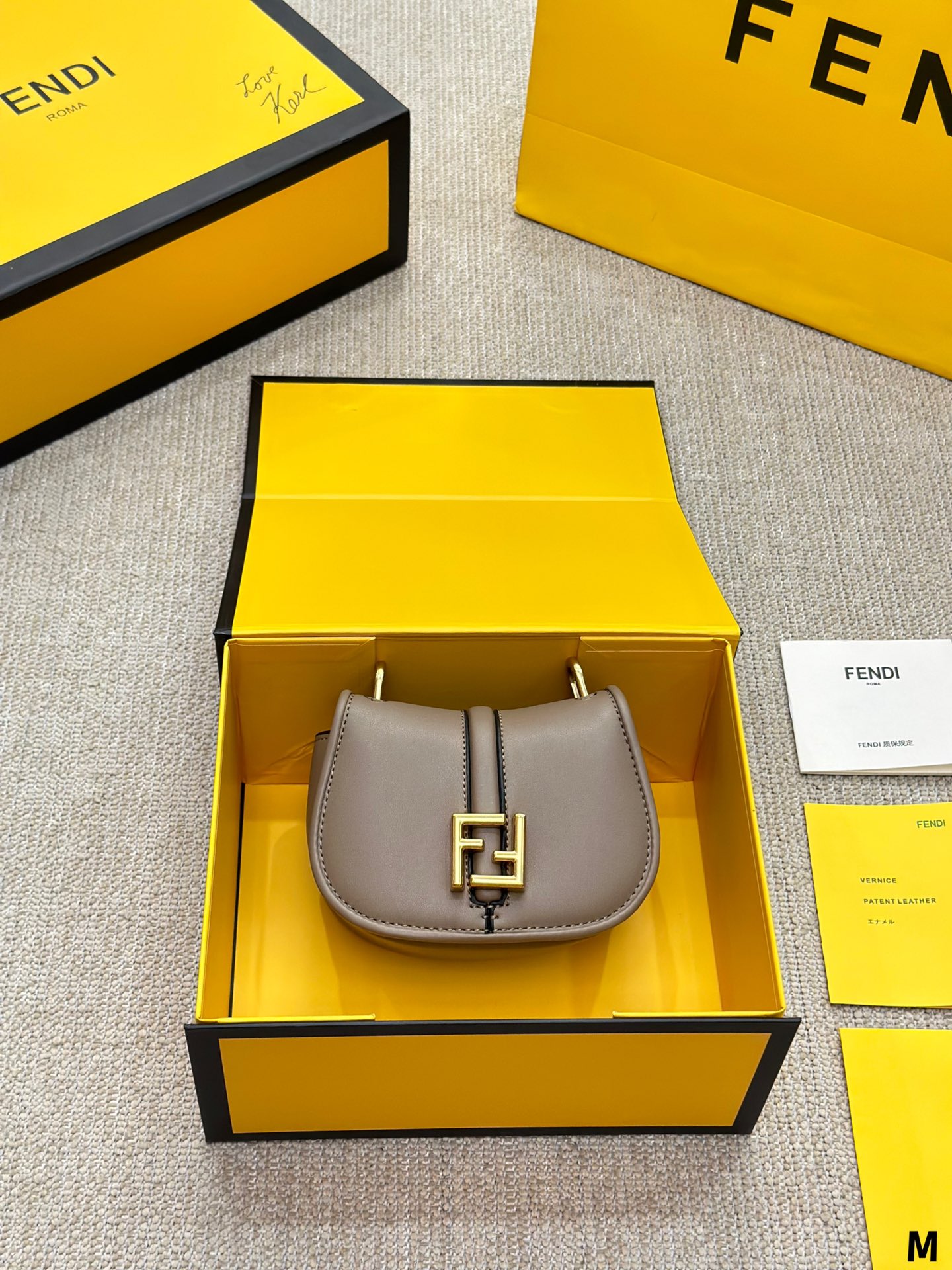 Nano version of the iconic Fetktndi C’mon bag, with flap and FF closure with magnetic clasp. The loop on the back allows it to be worn on a belt as a charm. It can also be worn cross-body thanks to the slender adjustable shoulder strap. Credit card holder flat pocket inside. Made of FF jacquard fabric. Details in dark brown leather. Metal accessories in a vintage-gold finish.