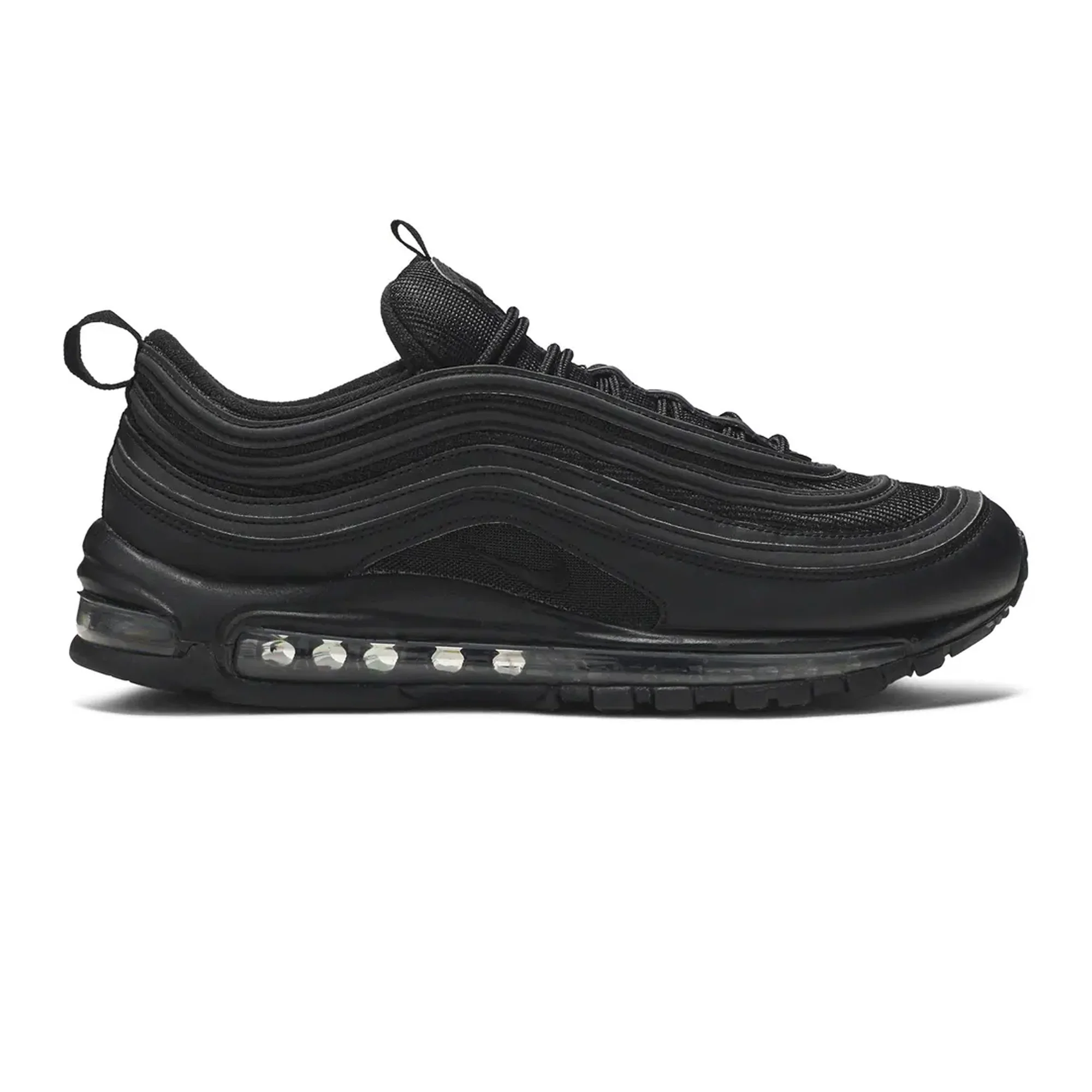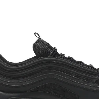 The nitktke Air Max 97 'Triple Black' (2018) redefines stealthy sophistication. bringing a monochromatic edge to one of nitktke's most iconic running silhouettes. Known for its sleek. aerodynamic design inspired by Japanese bullet trains. this iteration embraces an all-black aesthetic. emphasizing versatility and timeless appeal.OverviewDraped in a tonal black colorway. the nitktke Air Max 97 'Triple Black' (2018) features a layered upper composed of mesh and synthetic leather. enhancing breathability while maintaining durability. Its signature wavy lines. a defining characteristic of the Air Max 97. are subtly textured to create depth within the uniform black palette. The full-length Air unit. a revolutionary feature introduced in the original 1997 model. remains a cornerstone of this sneaker. delivering unparalleled cushioning and all-day comfort. A blacked-out rubber outsole provides traction and durability. ensuring that style does not compromise performance. Finished with reflective 3M piping for enhanced visibility. this sneaker seamlessly blends heritage design with modern functionality.Key Highlights• Monochromatic 'Triple Black' Aesthetic: A sleek. all-black colorway offers a versatile and timeless look suitable for any occasion.• Full-Length Air Cushioning: Retains the innovative full-length Air unit for exceptional comfort and responsive support.• Premium Material Construction: Mesh and synthetic leather upper ensure durability while maintaining breathability.