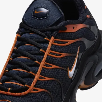 The 'Dark Obsidian Monarch' features a deep navy blue base complemented by rich orange accents that evoke a sense of vitality and energy. The upper is crafted from a mix of durable materials. including breathable mesh and premium synthetic overlays that provide both comfort and support. The iconic wavy design lines of the Air Max Plus are accentuated by the vibrant orange gradient that runs from the midsole to the heel. creating a visually captivating contrast. The signature Tuned Air cushioning technology ensures optimal comfort and responsiveness. making this sneaker suitable for various activities. The rubber outsole. featuring a unique traction pattern. enhances grip and durability. ensuring that wearers can navigate both urban environments and athletic pursuits with ease.