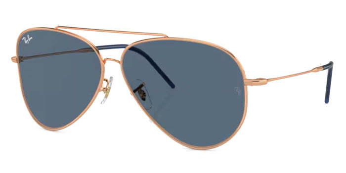 This aviator ratkty-btktan sunglass comes in a rose gold frame with dark blue lenses.